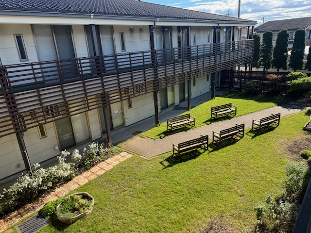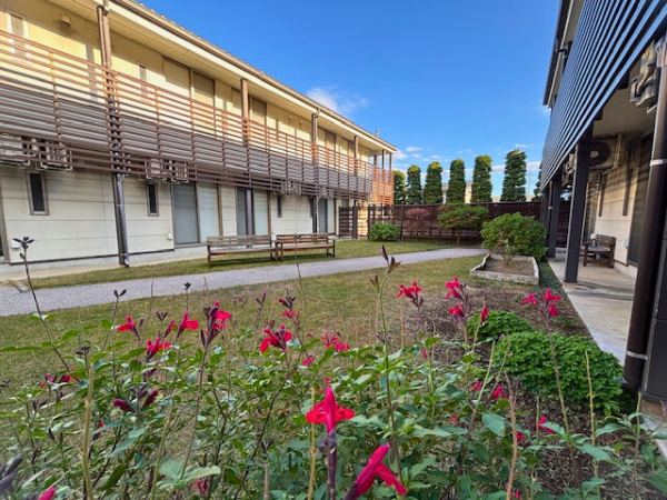 中庭ではイチゴ狩りや夏野菜の収穫、お茶会を催したりと、入居者様達の笑顔があふれています。